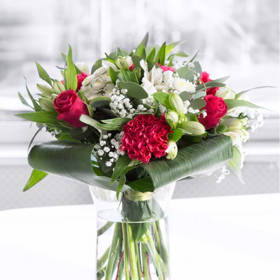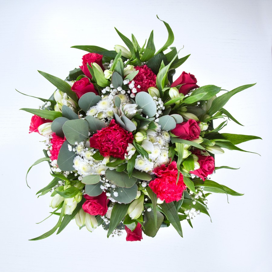 Enhance your special moments with our unique and beautiful bouquet. This exquisite arrangement features a harmonious blend of white chrysanthemums, delicate gypsophila, bold red roses, and charming carnations, artfully arranged with white alstroemeria and vibrant aspidistra leaves.