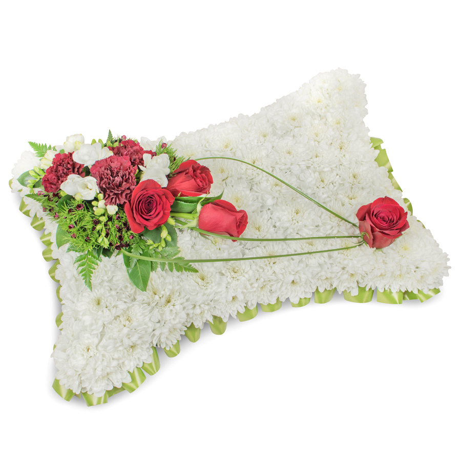 Offer your heartfelt sympathy with our luxurious flower arrangement, designed to provide comfort and elegance. This exclusive bouquet includes a beautiful mix of white chrysanthemums, stunning red roses, aromatic white freesias, rich dark red carnations, delicate dianthus, and graceful bear grass.